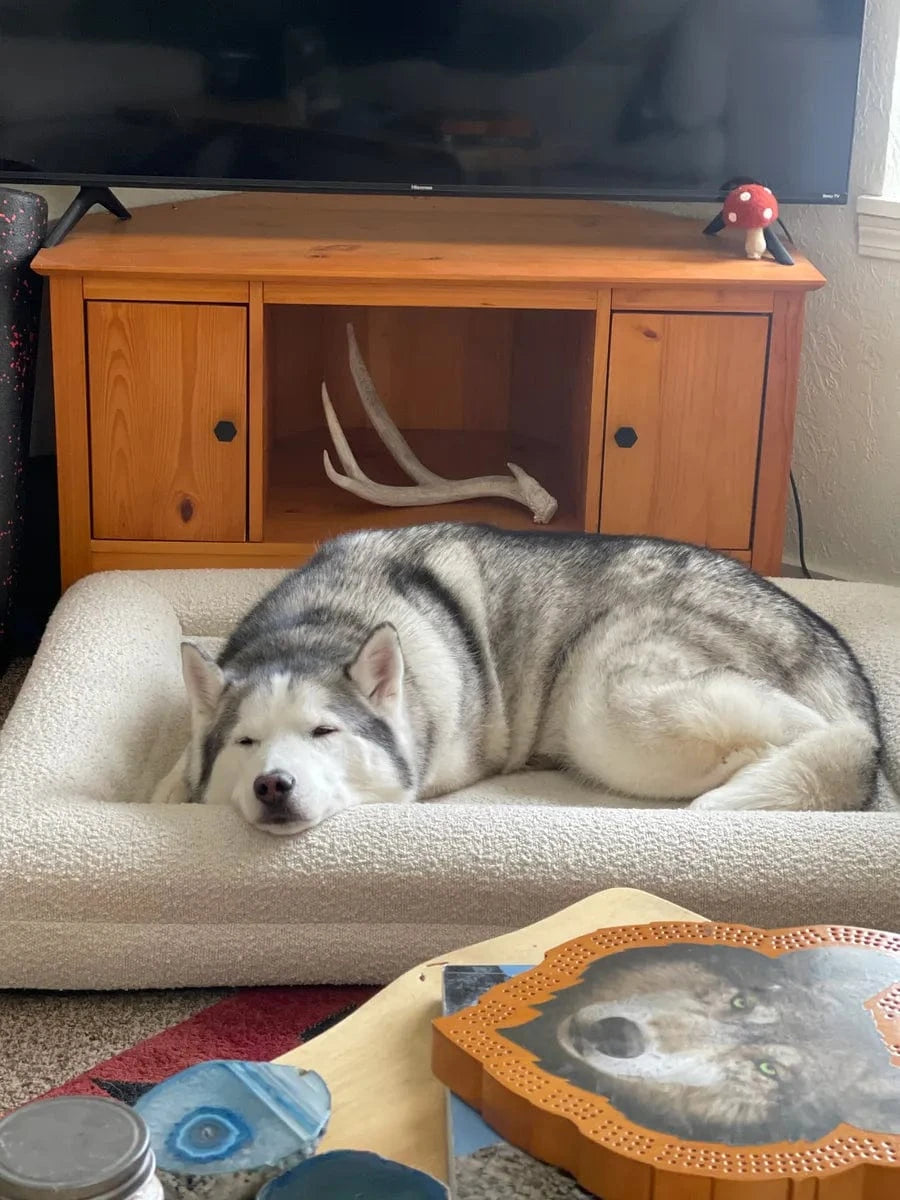 My husky is obsessed with this bed! I’ve never had a dog bed that he actually likes (he is very particular), but he spends every night sleeping in it. I love the boucle cover too, it matches the rest of my living room.