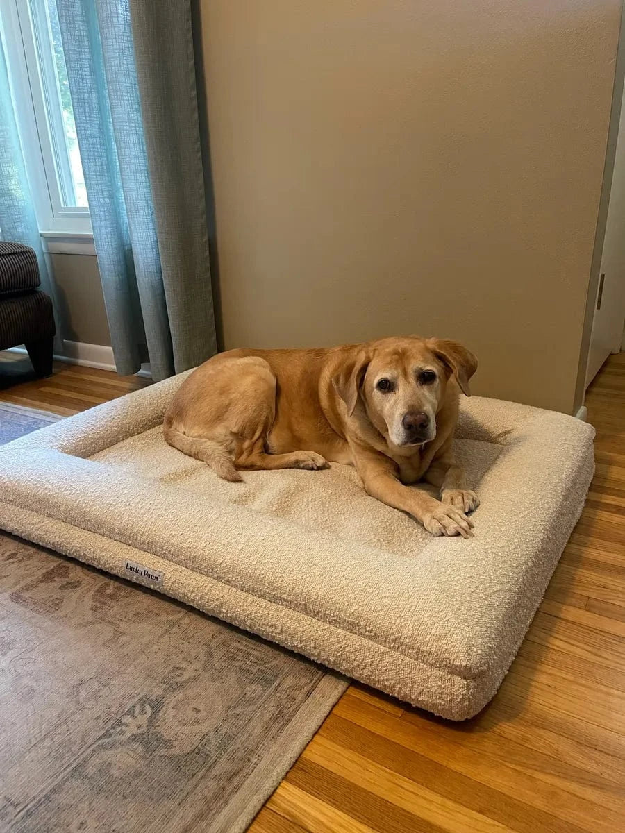 Our lab (Eleanor)has a better bed then we do now!! The bed is very cozy, aesthetically pleasing, and made out of great material/fabric! Seems like this bed will last a long time!! We have one happy doggie!